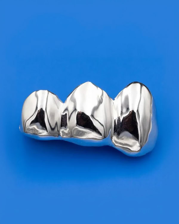 The Chrome Three-Piece is made from biocompatible metals selected for oral use — materials that sit comfortably against teeth and gums without irritation or pressure on surrounding surfaces. The chrome finish is applied across a dental-grade base that resists tarnishing and wear, maintaining its reflective surface over extended wear.
