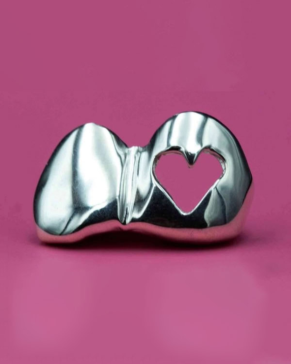 With minimal metal throughout, the grill sits lightly without bulk or weight. Its smooth silver finish is polished to catch light cleanly, making the outline and heart detail more noticeable when worn.